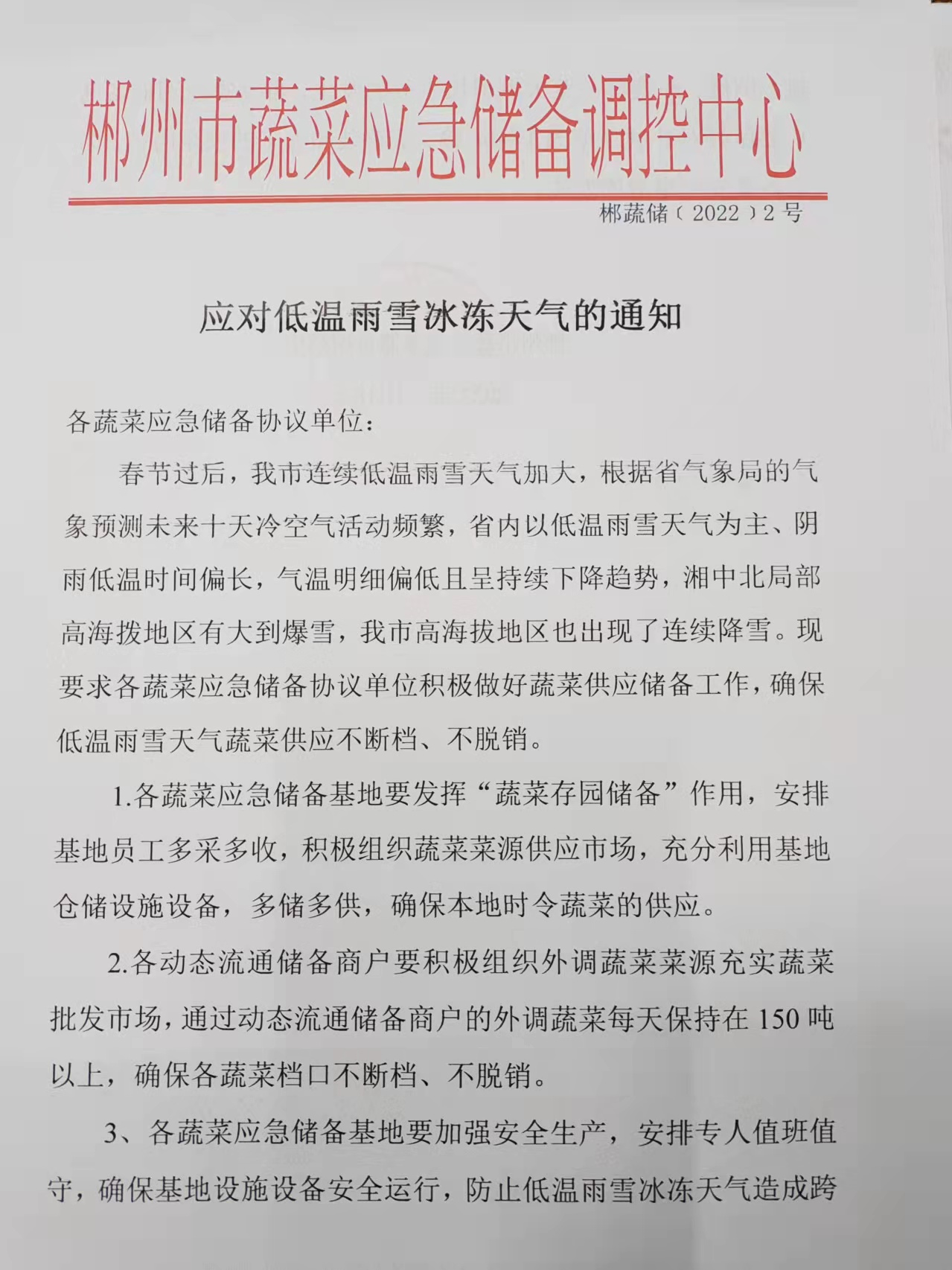 应对低温雨雪天气的通知